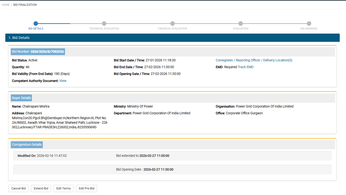 Power Grid Corporation of India Limited, Centralized Procurement Cell, 3rd Floor, Plot No. 2AINS 02, Avadh Vihar Yojna, Amar Shaheed Path, Near Medanta Hospital Lucknow- 226002 (UP).
