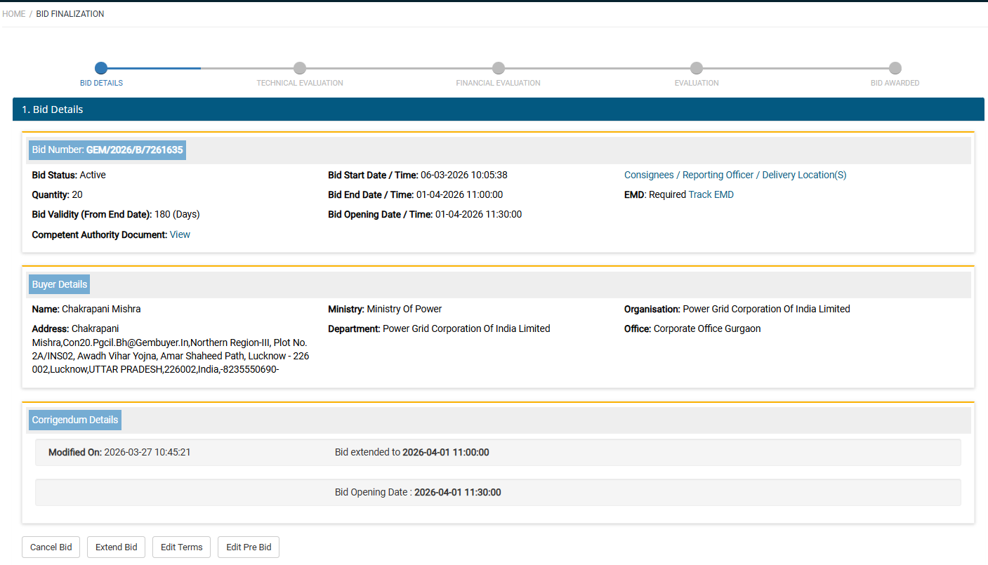 Power Grid Corporation of India Limited, Centralized Procurement Cell, 3rd Floor, Plot No. 2AINS 02, Avadh Vihar Yojna, Amar Shaheed Path, Near Medanta Hospital Lucknow- 226002 (UP).