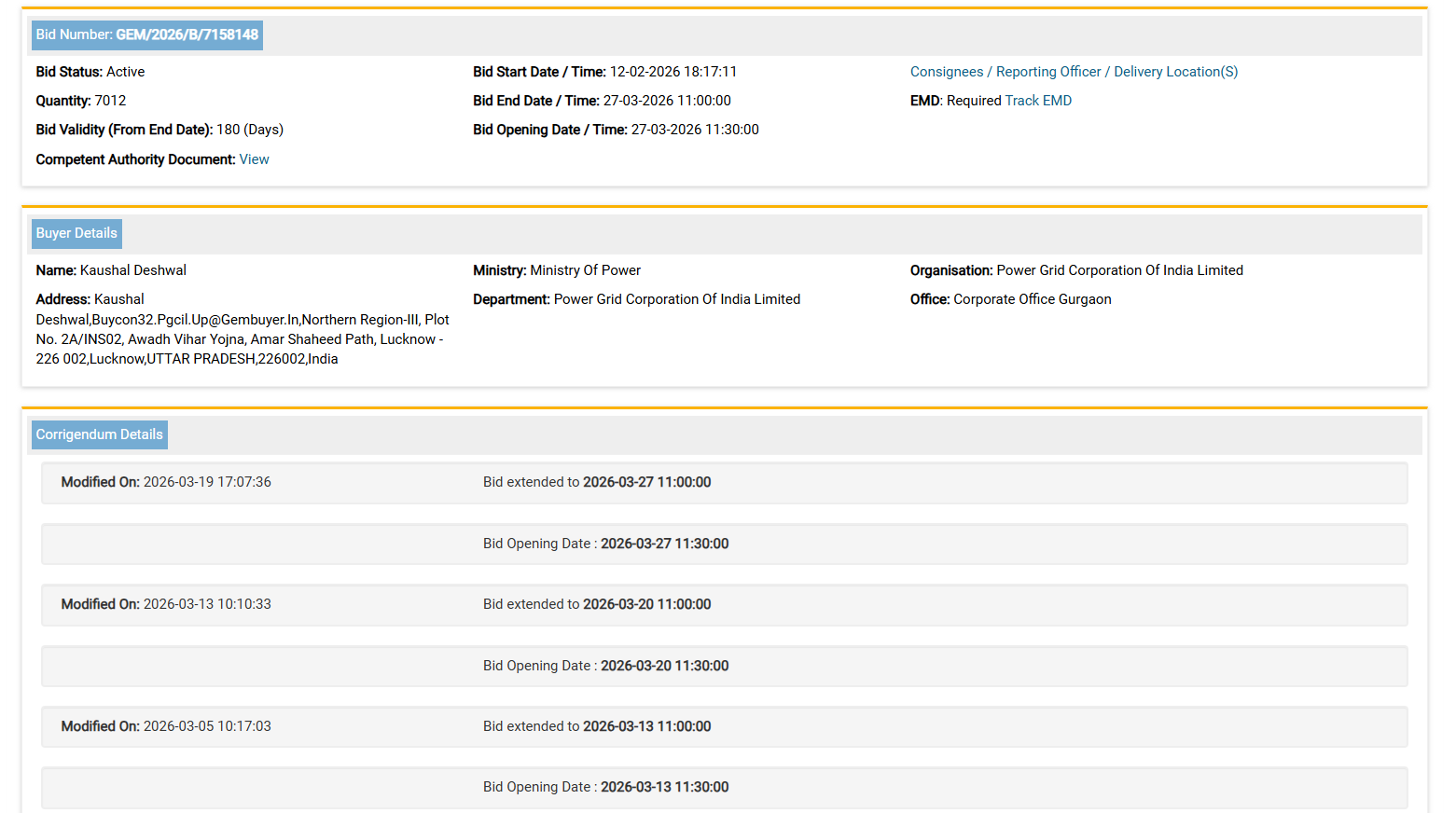 Power Grid Corporation of India Limited Central Procurement Cell, Plot No. 2A INS 02, Avadh Vihar Yojna, Amar Shaheed Path, Near Medanta Hospital Lucknow- 226002 (UP)